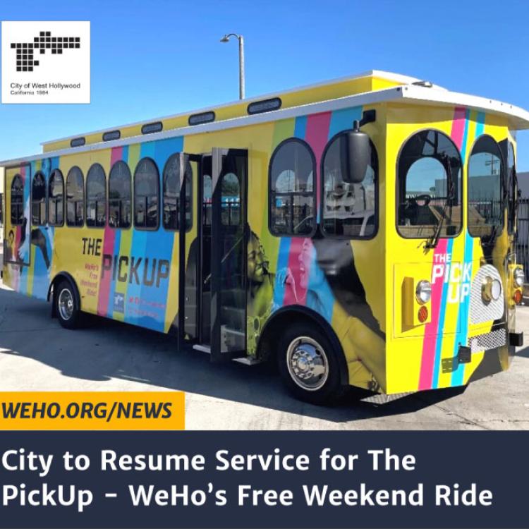The City of West Hollywood will resume service today for The PickUp, WeHo’s Free Weekend Ride. The PickUp will travel along Santa Monica Boulevard in a loop with stops in each direction between N. Robertson Boulevard and N.